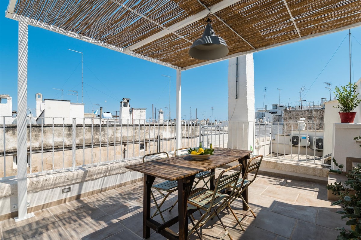 CIS: BR07401291000000188 CIN: IT074012B400033730 Vivi la magica sensazione di trovarti tra passato e presente: è una dimora storica! I pavimenti d'epoca e le pareti in pietra fanno da sfondo a un ambiente arredato con oggetti di design, vecchie ceramiche e mobili locali. L'ampio terrazzo privato, con solarium e doccia calda, saprà entusiasmarti: potrai rilassarti con un bicchiere di vino al tramonto, godere del sole su comodi lettini o preparare una cena in una magica atmosfera pugliese.