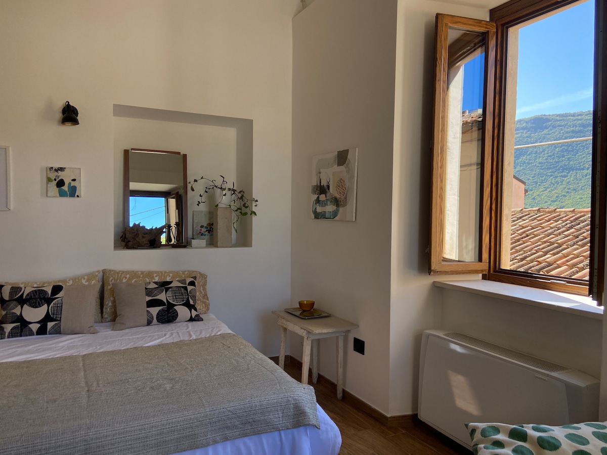 nel cuore del centro storico del paese, a soli 7 km da campo felice. Accogliente e molto luminoso, finemente ristrutturato, ingresso indipendente, termoautonomo , riscaldamento a pavimento, due livelli con pratico divano letto al piano inferiore e camera da letto matrimoniale con bagno interno a quello superiore.Entrambi i bagni sono dotati di doccia, bidet, finestra. Vista romantica e panoramica. Raggiungibile in auto con possibilità di parcheggio nella piazzetta antistante.Wi-Fi NO ANIMALI