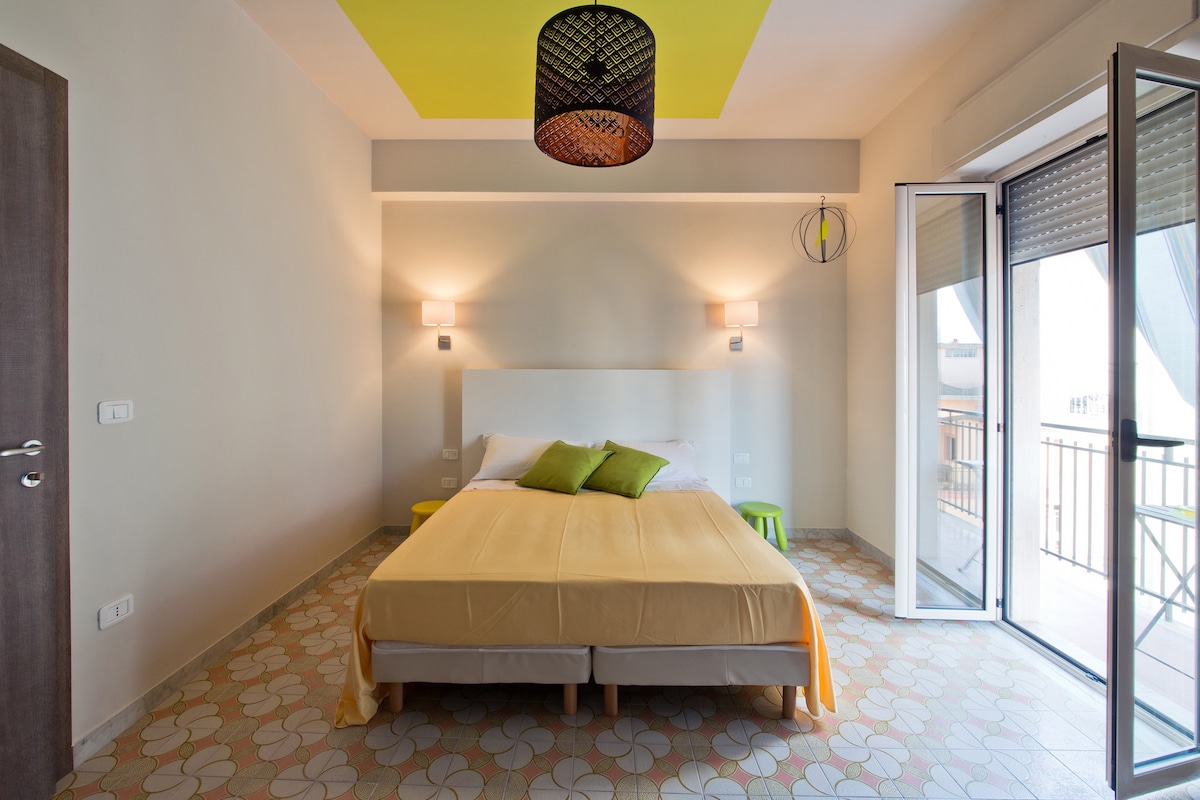 La camera matrimoniale offre un ampio terrazzo privato . Dispone di ingresso esterno autonomo, bagno interno privato con doccia, climatizzatore, cassetta di sicurezza e mini-frigo. Il terrazzo, con vista mare laterale, è attrezzato con sedie e tavolino, garantendo agli ospiti un ampio spazio esterno privato.
