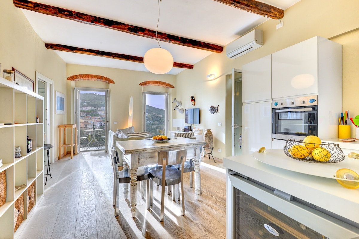 Bellissima mansarda openspace con terrazza sul tetto con vista sulla baia mozzafiato, luminosissima e completamente nuova, oggetto veramente particolare nel suo genere. La casa si trova in posizione privilegiata sotto tutti gli aspetti, in contesto residenziale e tranquillo su strada privata a due minuti a piedi da due meravigliose spiagge e a 10 minuti a piedi dal paese e da tutti i servizi. E' fornita di tutti i comfort e dispone di parcheggio privato incluso all'interno della proprietà.