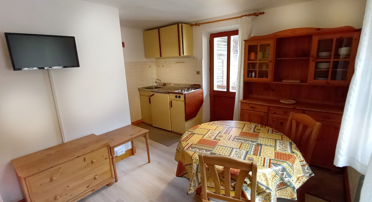 Alps Mountains. Italy. Aosta Valley. A cabin in a small village at 1600 meters,in the peace of meadows, grazing cows and mountains. Snow (usually) in the winter. A place of the heart, lovingly restored preserving the ancient beams of the roof. A wonderful view from the large windows and a special tranquility for those in search of peace, warmth and relaxation. The furniture is very nice: wood above all, but also more lively colors, and modern comforts. Quiet excursions, both on snowshoes or ski.