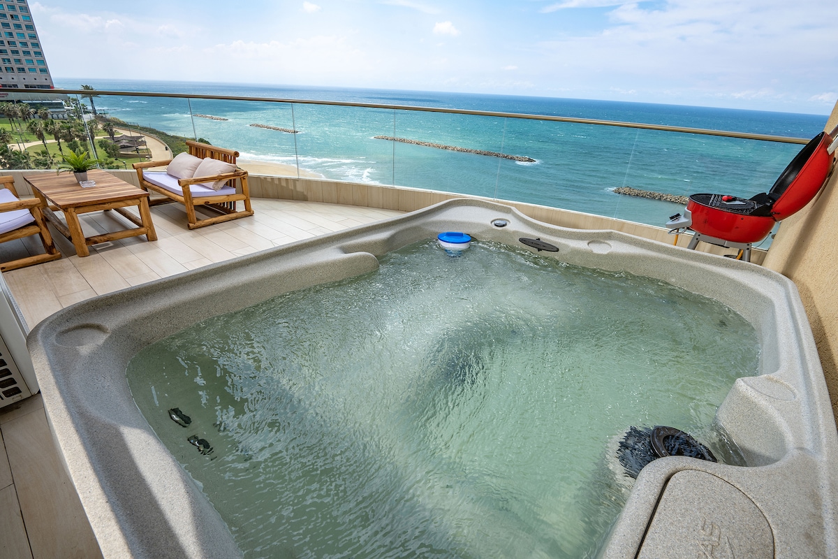Private luxury apt with sea view at a beautifulll resort. Master bedroom & living room have large windows over ocean view, kids bedroom with two twin beds. The complex includes free swimming pools, jym, squash, tennis cour, lush well-kept gardening and playgrounds. 5 min drive from the old city & There are 2 big shelters in each level of the building. The apt is 15 meter from each of them.