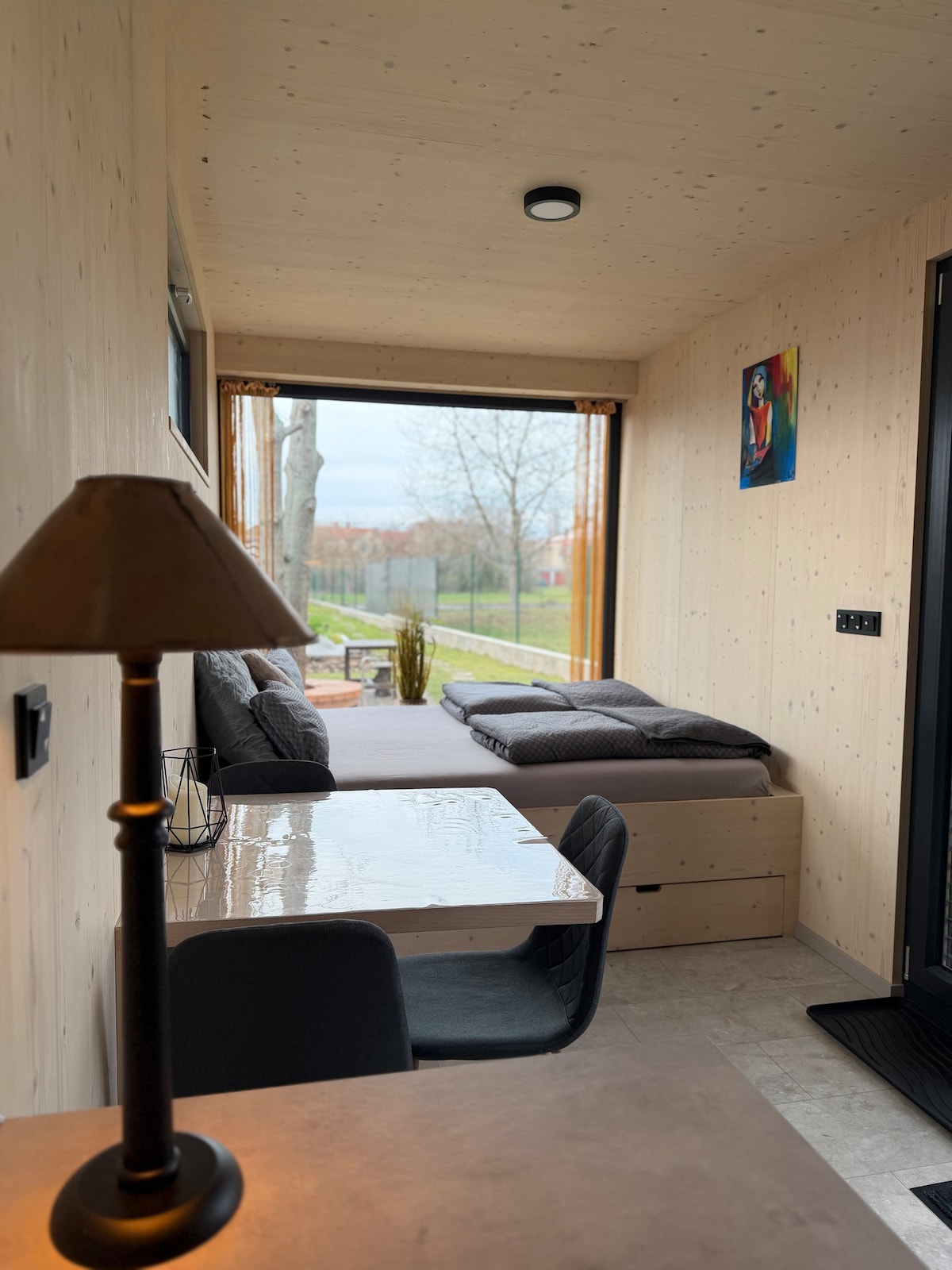 Moderní a klidné místo na jednu noc i celý týden. Prosklená terasa s posuvnými stěnami nabízí soukromí a příjemné posezení po celý rok. Vhodné pro páry, rodiny i služební cesty.