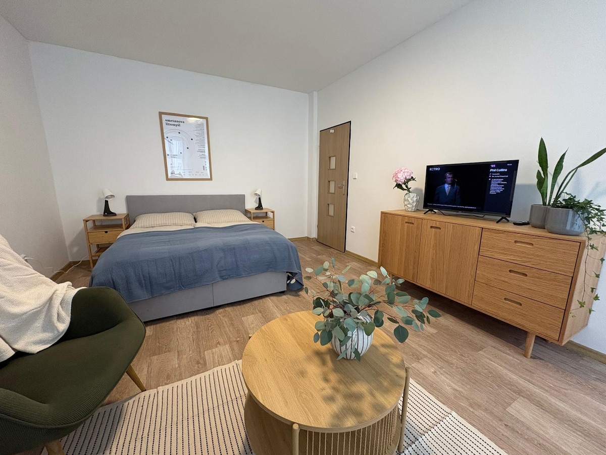 Moderní byt v klidné lokalitě 5 minut chůze od centra Litomyšle. Nachází se ve 4. patře bytového domu a je plně vybavený. Byt obsahuje: - obývací pokoj s rozkládacím gaučem a kuchyňským koutem - ložnici s úložným prostorem - koupelnu s toaletou - balkon s posezením ENGLISH Modern apartment in quiet location within 5 min walk to Litomysl center. Apartment is located in 4th floor and is fully equiped. Apartment has: - living room with kitchen - sofabed - bedroom - bathroom with toilet - balcony