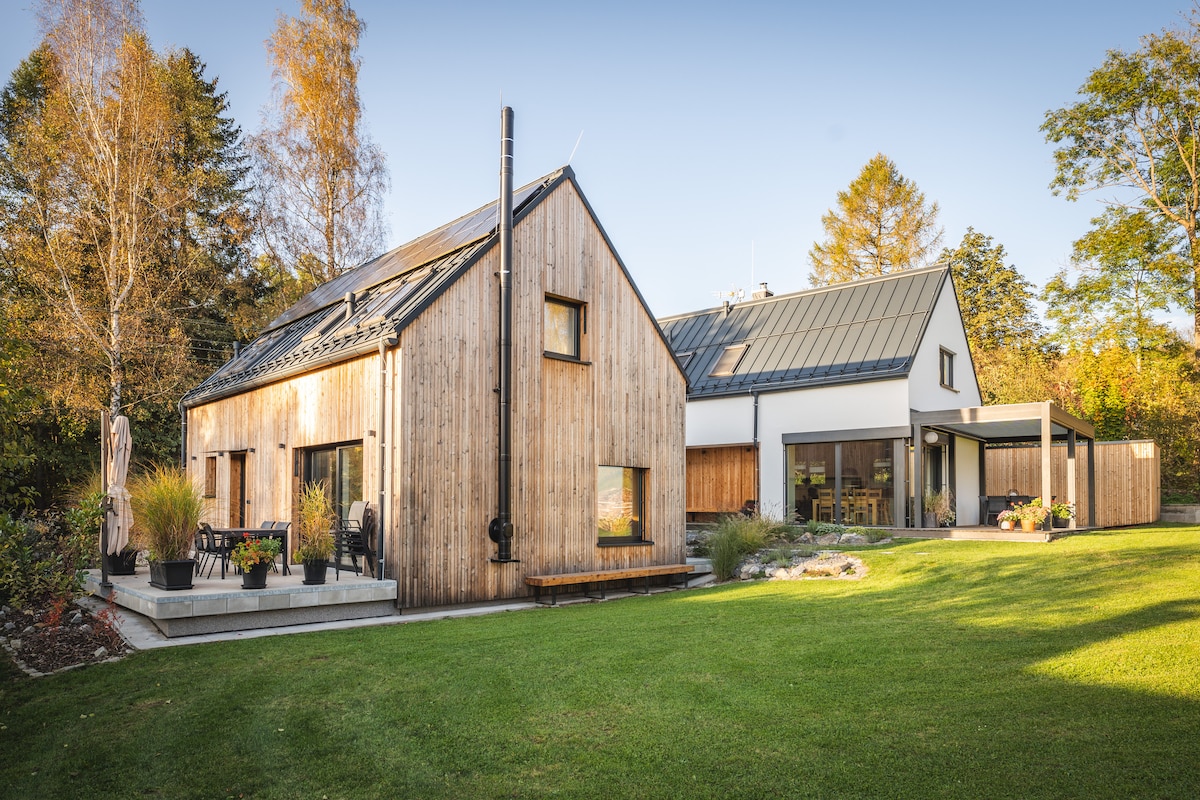 Enjoy the beautiful surroundings of this romantic place in the heart of nature. Our house stands deep in the forest where you will be surrounded by only silence and peace. It is an ideal place to relax and recharge your batteries. All with the comfort of a five-star hotel. Finnish sauna, outdoor heated hot tub - in short, everything you expect from a pleasantly spent rest.