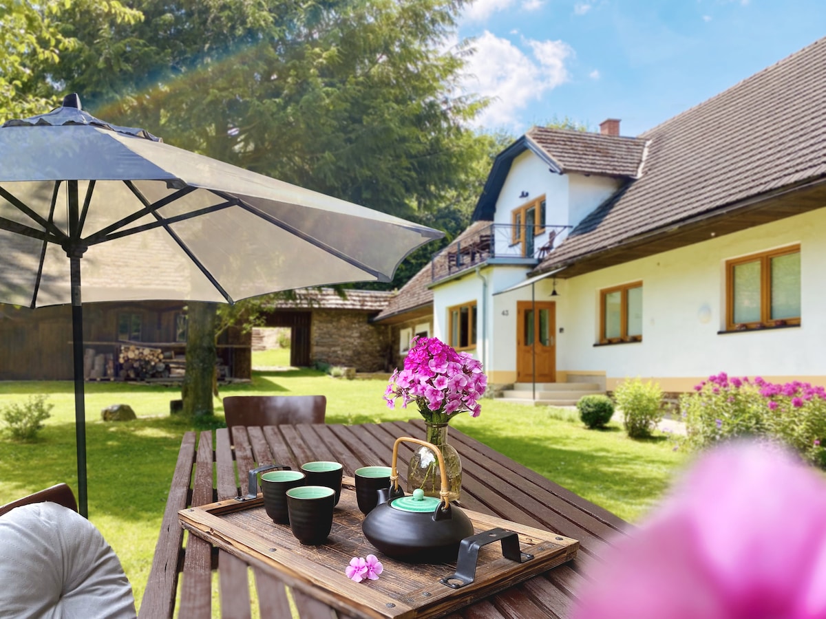 Spacious cottage with terrace over river, cottage included own beer tapping equipment, fireplace, barbecue and swimming pool,there is two double bedroom for couple and big attic room for six people , antique tiled fireplace, 2x living room with LCD TV, around cottage cycling trails, many ski resorts and reservoir