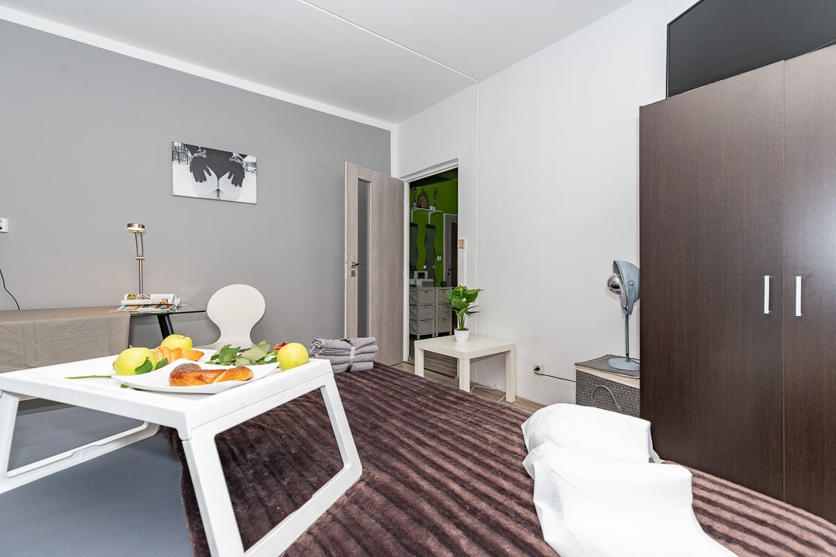 Stylový apartmán 120 m2 přímo v centru s parkováním zdarma. Najdeš zde ložnici s velkou manželskou postelí a TV. Terasu s úžasnou atmosférou a výhledem. Obývací pokoj s TV je vybaven křesly a rozkládací koženou sedací soupravou, na které se plnohodnotně vyspí dva lidé. Obývací pokoj je propojen s kuchyní a jídelnou. Kuchyň je plně vybavena. Najdeš zde vše od myčky až po automatické espresso. Prostor je vybaven klimatizací. Líbit se Vám bude i koupelna se sprchovým koutem a bidetem. Těšíme se!