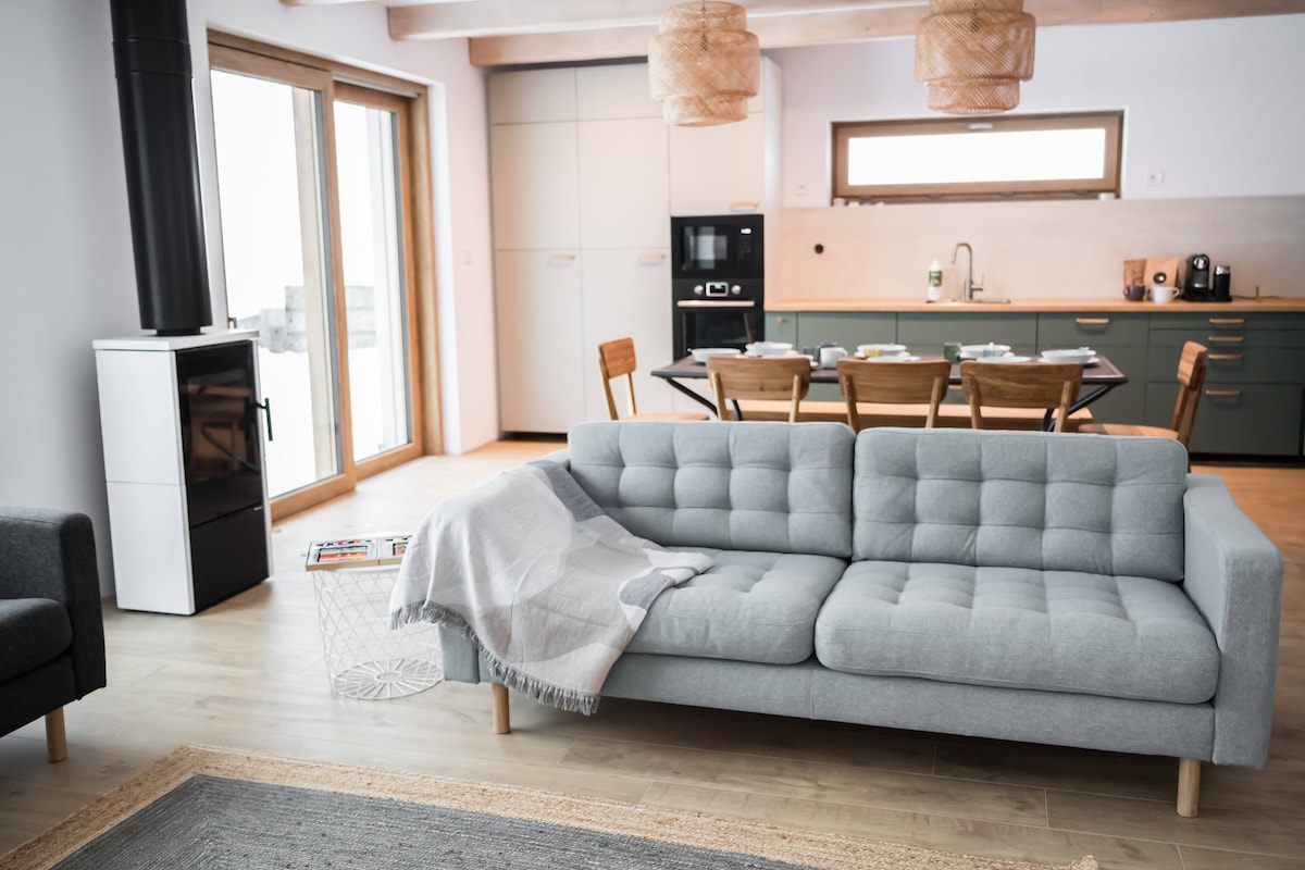 Rádi vás přivítáme v našem rodinném domě, kde budete mít k dispozici byt s vlastním vchodem. Využijte vlastní koupelnu s krásnou vanou, prostornou kuchyň a místo pro odpočinek nebo i práci. Ubytování je vhodné i na delší dobu, protože zde najdete vše jako u vás doma. Pračku, plně vybavenou kuchyň s myčkou na nádobí, kávovarem, varnou deskou i troubou. Parkování před domem, vysokorychlostní Wi-Fi nebo úschova kol či lyží jsou samozřejmostí. Těšíme se na vás. Mikuláš a Eva s rodinou.