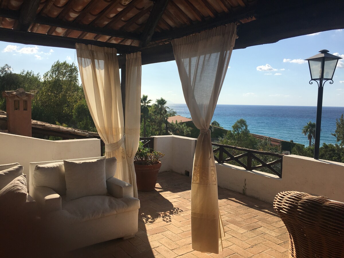 A stylish newly refurbished apartment perched on the hills just a few minutes drive from Tropea. Beautifully decorated with stunning views of Tropea and the Aeolian sea from a large terrace. Private and secluded undercover seating and dining. Use of pool and jacuzzi (May-September only). Set in beautifully landscaped gardens. A relaxing and peaceful retreat. A short drive from award winning beaches. ENJOY A WELCOME PACK OF LOCAL WINE & PRODUCE ON ARRIVAL.