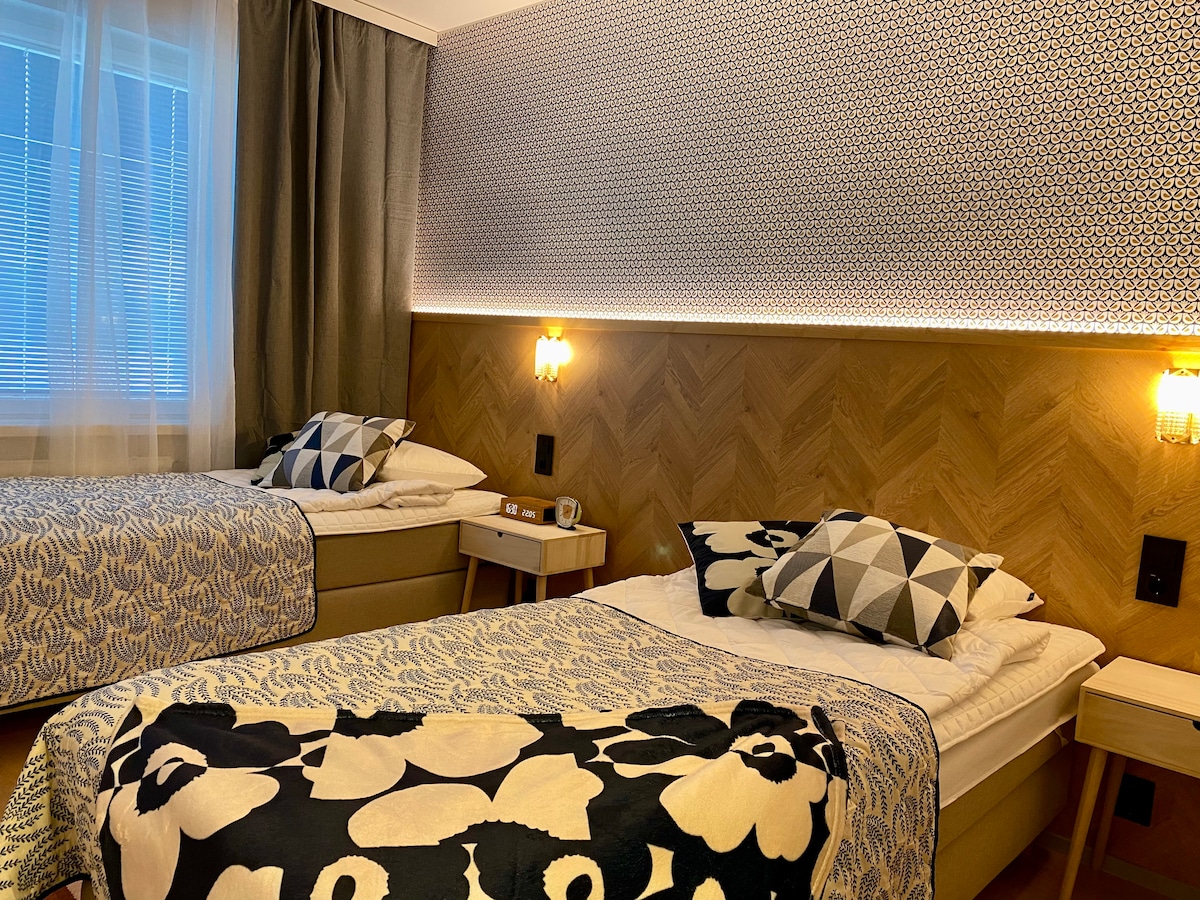We have very good beds and you sleep well! Nighttime any noice. Very silence place. Have a good night and sweet dream! Every sheets and towels is ready on the beds. Here is big 55" smart-TV, free wifi and bluetooth music-player. Cross-country skiing possible because only 100m is forest and ski-road. You can rent equipment same house Superkirppis -second-hand -shop. Fitness equipment in the house. Prisma-Supermarket and restaurang 200m. WELCOME!