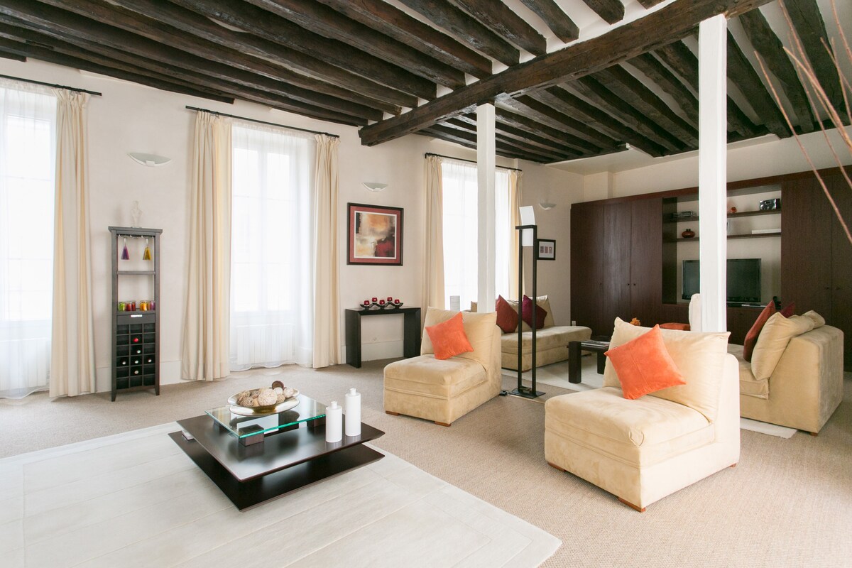 Charme et confort au deuxième étage d'un immeuble du 16ème siècle (troisième étage pour les Américains), dans une impasse calme et pourtant en plein centre de Paris. Poutres apparentes, tomettes, décoration contemporaine, oeuvres d'art du monde entier, grand séjour de 50m2, 2 chambres et 2 salles d'eau, quartier vivant et commerçant, tous transports à proximité. Fauteuil convertible en lit une place dans le salon (déplié, le lit fait 80cm x 190cm). Attention : il n'y a pas d'ascenseur.
