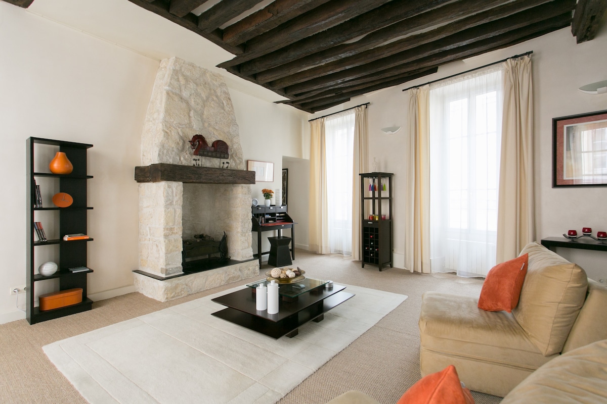 Exceptional 2 bedroom /2,5 bathrooms apartment, fully renovated with original floors and decorated with style in the very heart of Paris. Walking distance to all attractions, and direct access to all airports & train stations with 8 RER/Metro lines via the brand new exit facing the apartment (Place Margherite de Navarre access opened in July 2017). Internet+TV, washer, separate dryer etc.