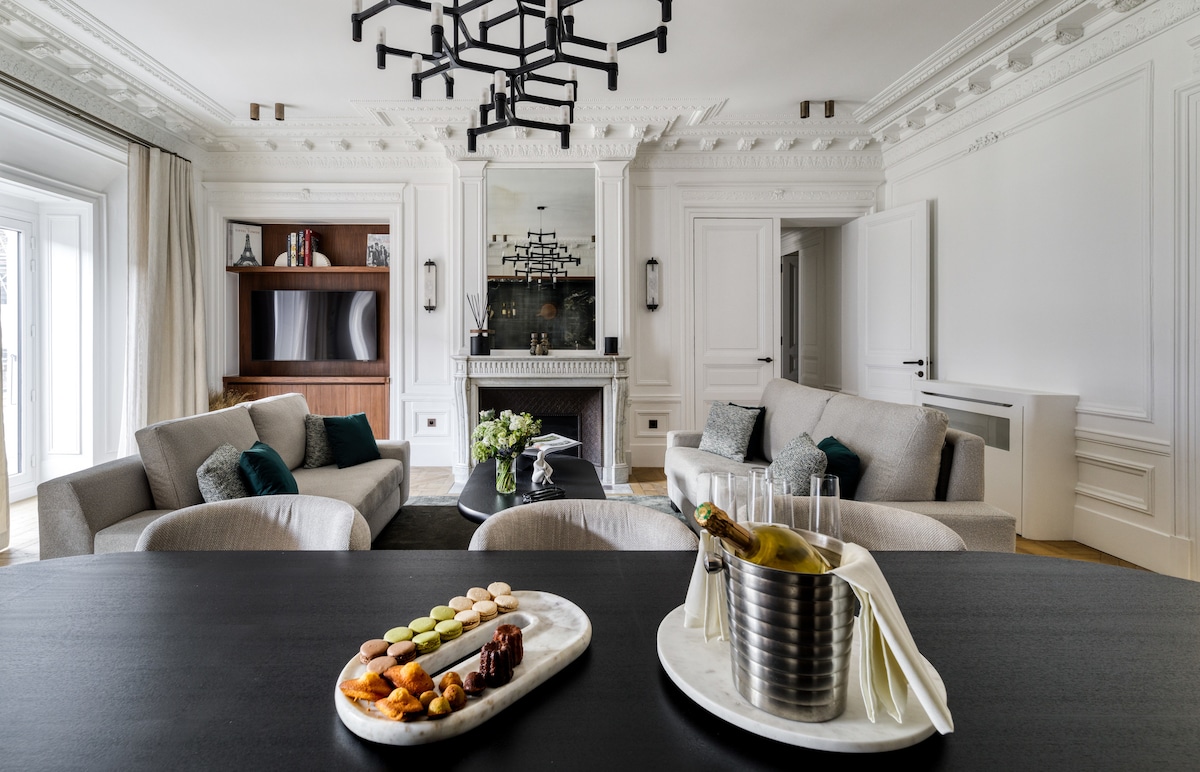 Ce magnifique appartement composé de 5 chambres et rénové par un architecte est situé à deux pas de l'Arc de Triomphe et de la Tour Eiffel. Son atmosphère feutrée et chaleureux est une véritable invitation au lâcher prise et au repos. Pour un voyage d'affaires ou en simple visite dans notre belle capitale, nous vous proposons de vivre comme un parisien le temps d'un séjour.