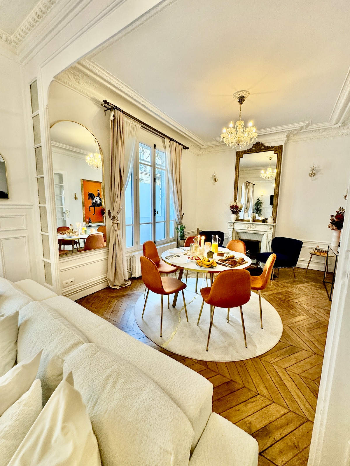 Boasting herringbone parquet flooring, fine furnishings and abundant natural light, this sophisticated 110m2 apartment offers a bright, elegant, warm and luxurious atmosphere. The apartment, with fireplace and moldings, combining charm, calm and comfort is located in one of the oldest passages in the historic center of Paris. This apartment has an official tourist accommodation operating license. So it's perfectly legal.
