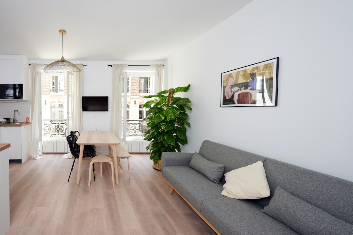 Welcome to our one-bedroom haven, meticulously designed with taste. Enjoy the calm of the courtyard and its small terrace, while in the middle of a lively district. The space emanates a warm, home-like essence. Situated in the heart of the trendy dining and café scene, on the banks of the canal Saint Martin, it's also a few blocks away from the historic charm of Le Marais district.