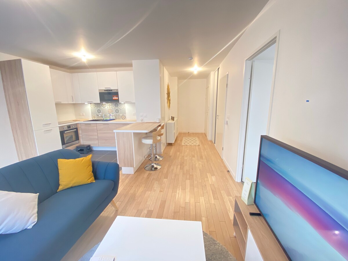 Détendez-vous dans ce logement calme et élégant de 42m2 bien desservi par les transports en commun qui en font le point de chute idéal pour découvrir Paris et ses environs. - Gares: Ligne D à 6min à pieds et ligne B à 8min à pieds - Métro 14: accessible à 8min à pieds - Centre de Paris accessible de la gare en 10min. Profitez également de sa proximité avec le Stade de France (8min à pieds) pour assister à des concerts, matchs de folies et jeux olympiques dans les meilleures conditions