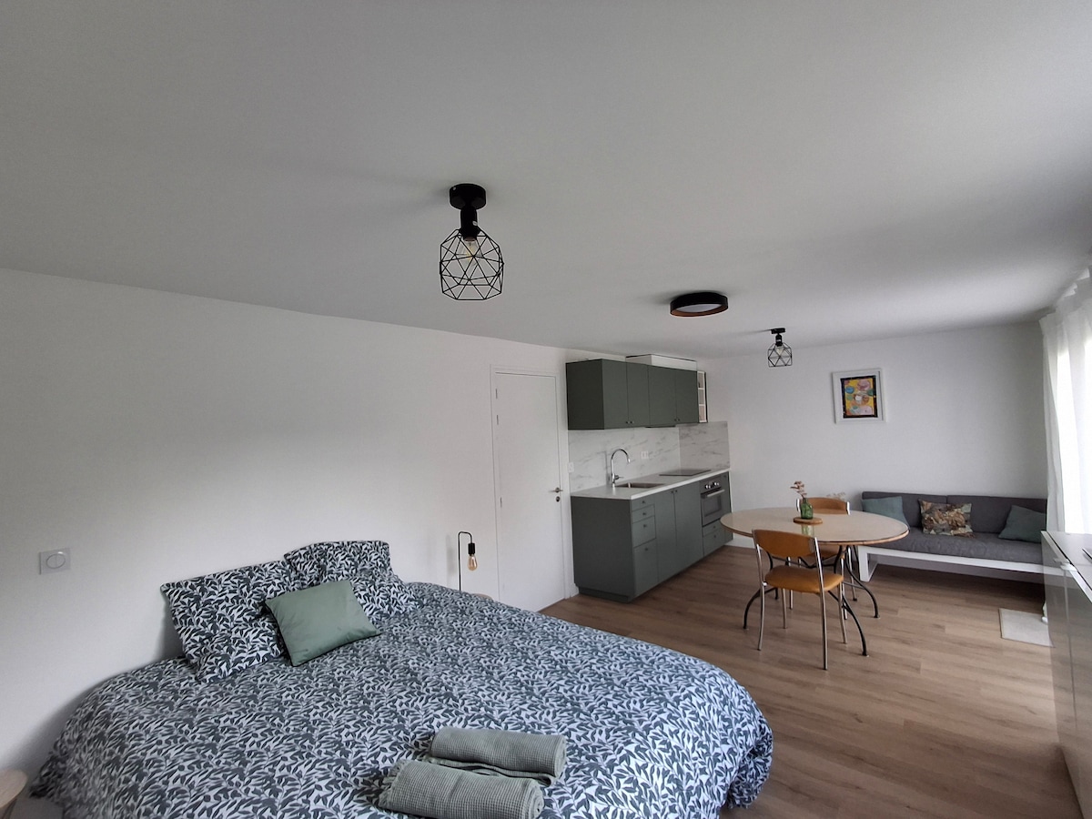 Studio lumineux de 20 m2, situé à 20/25 min à pied de Paris La Défense Arena. Studio situé dans un quartier calme, à 5/10 minutes à pied du RER A (centre de Paris à 15 min en RER), commerces à 3 min à pied. Studio avec cuisine équipée, petit coin salon, salle de bain et wc indépendants, en rez de jardin. Le studio se situe au rez de chaussée de notre maison. Linge de lit, linge de toilette, chiffons, nécessaire vaisselle inclus. Entrée indépendante. Fumeur et animaux interdits. Fête interdite.