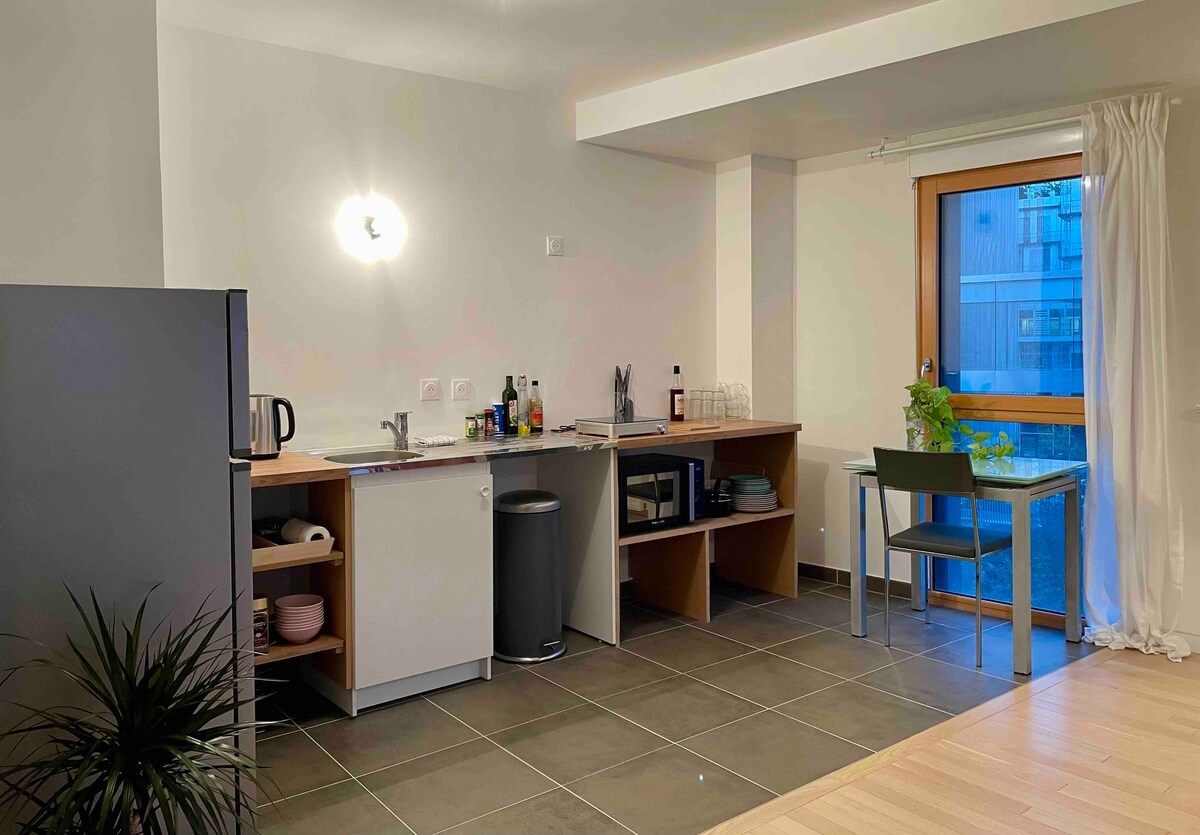 Studio moderne, lumineux et décoré avec goût. Profitez d’un espace cosy avec canapé confortable, grande baie vitrée et cuisine entièrement équipée. Rangements pratiques, salle de bain fonctionnelle et Wi-Fi haut débit. Idéal pour séjours courts ou professionnels, dans un quartier calme et bien desservi. Installez-vous et profitez d’un cocon chaleureux pensé pour votre confort.
