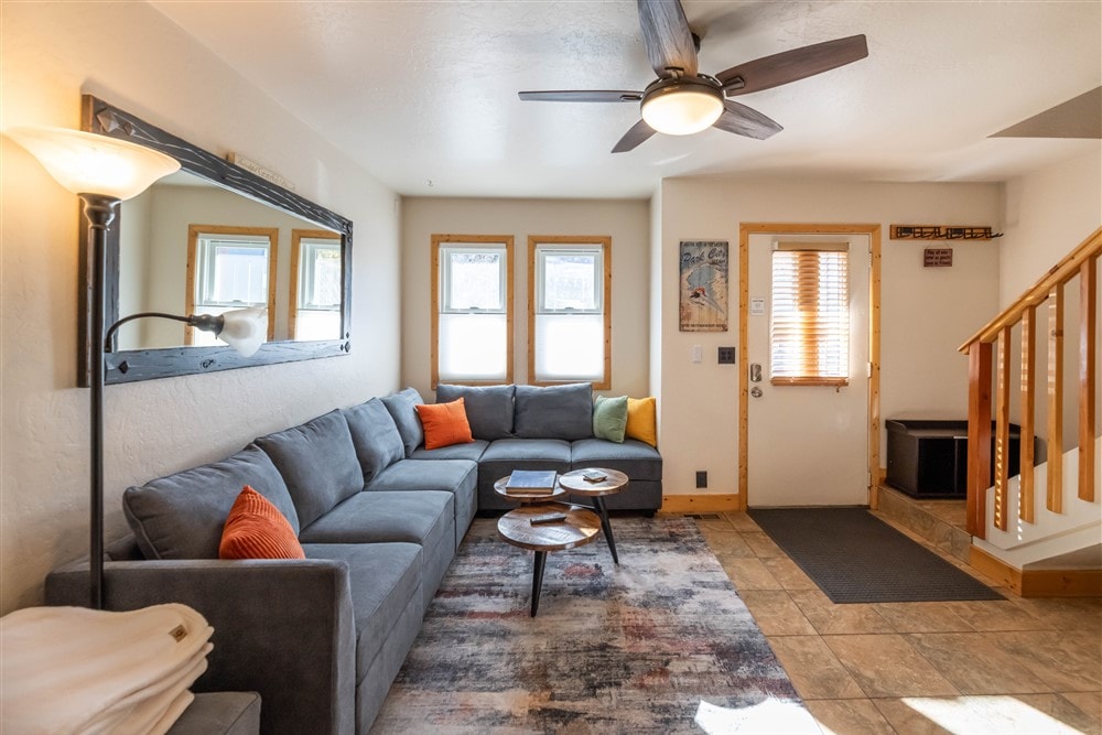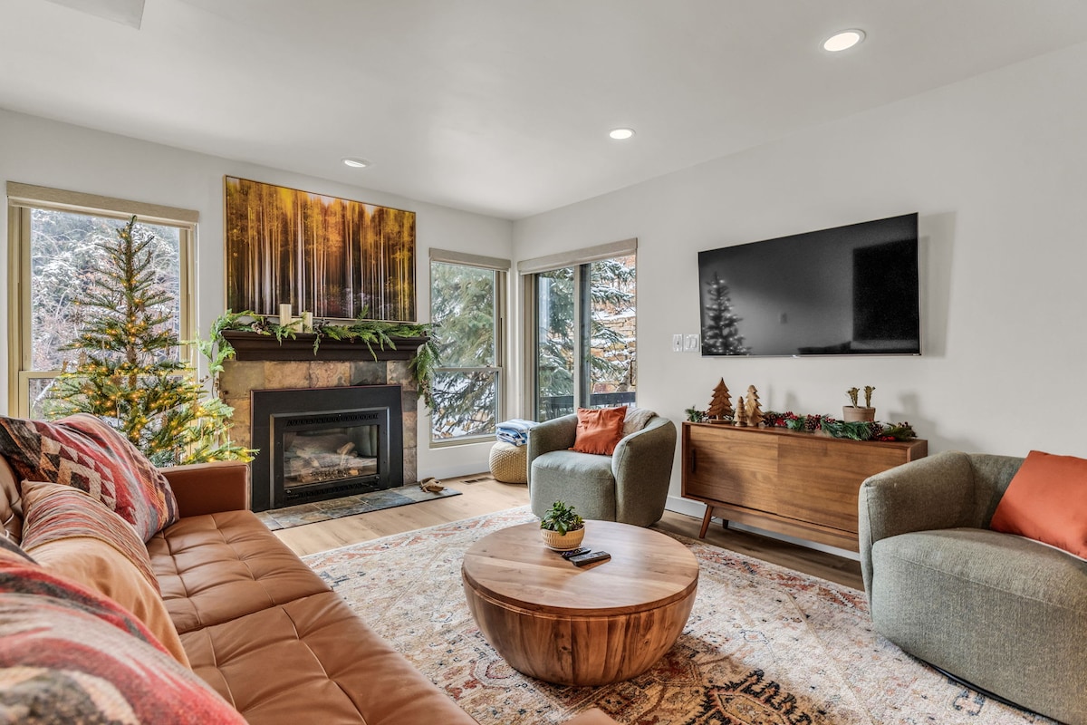 Relax in this beautifully designed two-level mountain condo at the base of Canyons. This family-friendly home has been thoughtfully designed, blending modern chic with a cozy rustic mountain feel, including vaulted ceilings with exposed wood beams and a stone fireplace. Located a short walk to the Cabriolet lift, there is no better starting point for your mountain adventures. Return home for a comfortable evening by the fire and your own private patio for grilling and taking in the views.