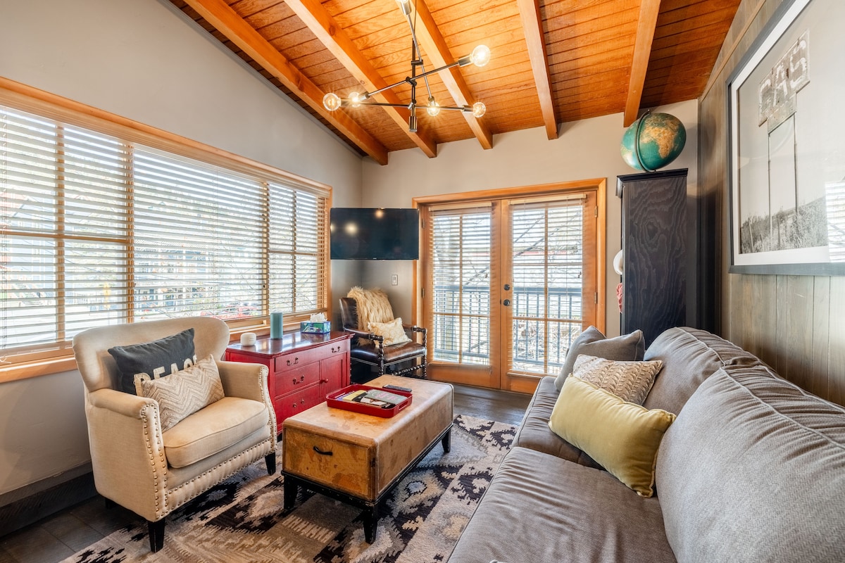 Welcome to your perfect getaway. Stroll up historic Main Street before checking in to this light-filled newly renovated loft. The high ceilings, modern yet rustic decor and the attention to detail throughout will make this a home base you won't want to leave. A king size bed with luxurious linens, a European tiled bath, original art, a kitchen and a balcony overlooking a park adjacent to Main Street only make this spot even more sweet! *25% off ski rentals *3 minute walk to Town Lift