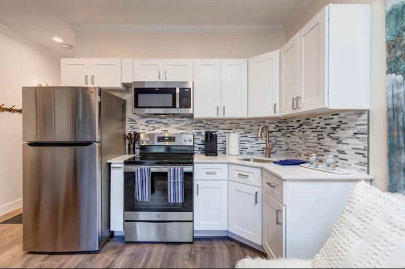 Keep it simple at this peaceful and centrally-located Condo. Has Super Comfortable King Bed and a Sleeper sofa for a 3rd guest. Comes with a Fridge, stove, Microwave, Keurig, Direct TV, Towels, and other amenities. Condo is located in a secured building with private parking. Several Restaurants within walking distance. Pool, Hot Tub, Laundry in Convention Center and now EV Charging. Rail Trail Right Outside The free bus line is right outside the building and they use the -MyStop - app.