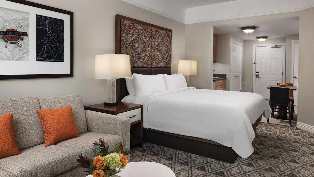 With historic Old Town Park City just outside your door, and the mountains steps away, you'll be hard pressed to fit everything in before dinner. Lucky for you, you won't have to go far, as famous Main Street dining, shopping and nightlife awaits you. Cozy meets comfort in this Junior Suite! Enjoy the modern kitchen, updated living space, and beautiful balcony. The decor of this suite has a mountain feel, truly transporting you to Park City. There’s so much to love about this quaint space!