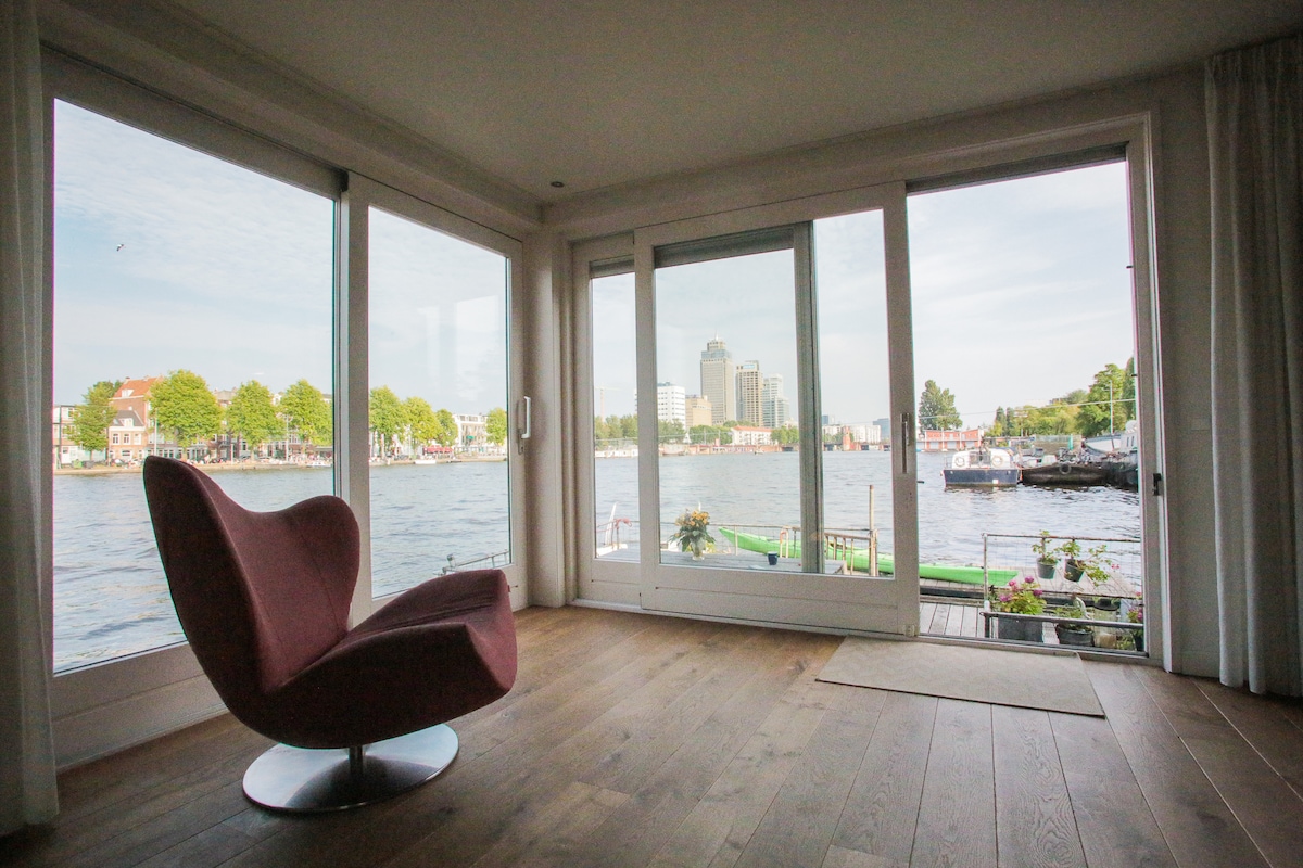 Entire private Houseboat with the best view of the river Amstel in Amsterdam! Your secret super luxurious floating home in Amsterdam. There are 3 bedrooms, a nice bathroom with shower and bath, 2 toilets, a fully equipped kitchen and a big living room with the best view! The boat has central heating, so it is very comfortable the whole year around. There is also a terrace with table and chairs outside, so you sit there and watch the birds and the skyline of Amsterdam.