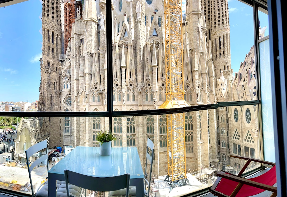 Enjoy Barcelona from this stunning penthouse featuring a spectacular 40 m² private terrace with breathtaking views ✨ of the Sagrada Familia and the city skyline. Bright, stylish and thoughtfully designed, this unique penthouse offers modern comfort & style, with an unbeatable location just one street from the iconic Sagrada Familia. Perfect for couples, friends, students or families with up to 2 children, the apartment can comfortably accommodate up to 4 guests.