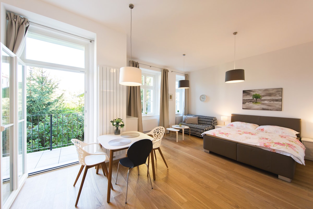Discover the charm of modern living in our designer studio at the Hagibor complex! Enjoy the comfort of home with a fully equipped kitchen, Nespresso coffee maker, and relaxing book or Netflix evenings. With a balcony, garage parking, and fast internet, it's an oasis of calm in the bustling city. Just a short walk from Želivského metro station on the green line, you're moments away from the historic city center. The perfect place for your urban adventure!:-)