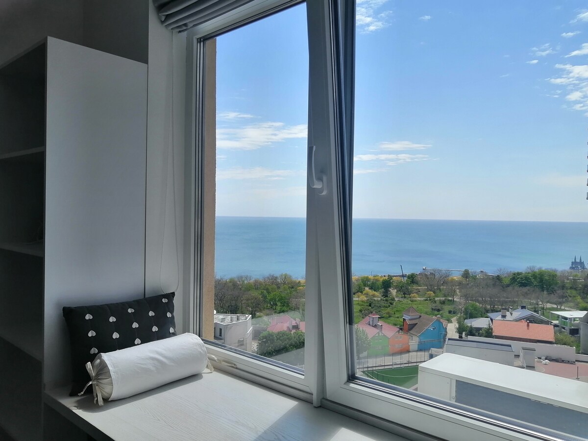 Apartment with private terrace and sea view! Cozy 2-room apartment in Arcadia, in residential complex "44 Perlyna". Located on the 20th floor, the building has 24/7 security. Accommodation for up to 4 guests. We have a convenient self check-in system with an electronic lock (24/7) The apartments are located 5-7 minutes' walk from Arcadia's beaches, water park and clubs. On the territory of the building you will find - pharmacies, supermarkets, coffee shops, the new post office, etc.