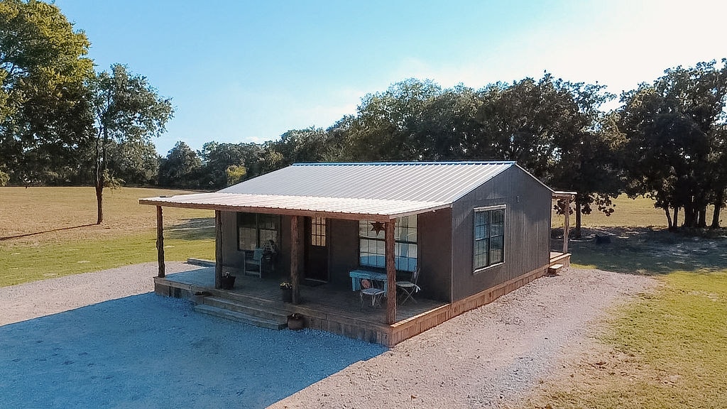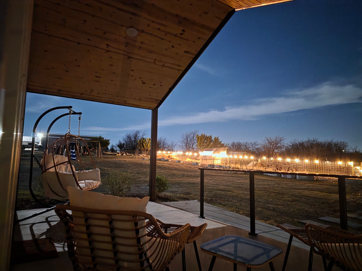 Modern guest house on a farm in the heart of town! Brand new industrial design with huge windows, stand-up shower, full kitchen, and private patio. Enjoy wildlife views, farm walks, pond access. Just 2 min to freeway, 3 min to Costco, 5 min to downtown Weatherford, and 23 min to Fort Worth.