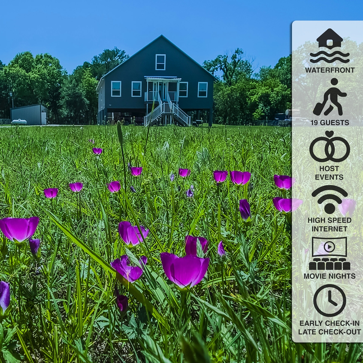 Experience modern waterfront living at Brazos Breeze at Tin Top! This inviting 2-acre retreat offers a variety of activities and comfortable accommodations for families and groups. Sleeps 19. Enjoy a private dock for fishing and boating, a home cinema for entertainment, a game loft for fun, and a firepit for evening gatherings. With a fully equipped kitchen, king beds, and ample space to relax, Brazos Breeze at Tin Top provides the perfect blend of adventure and comfort. Book your getaway today!