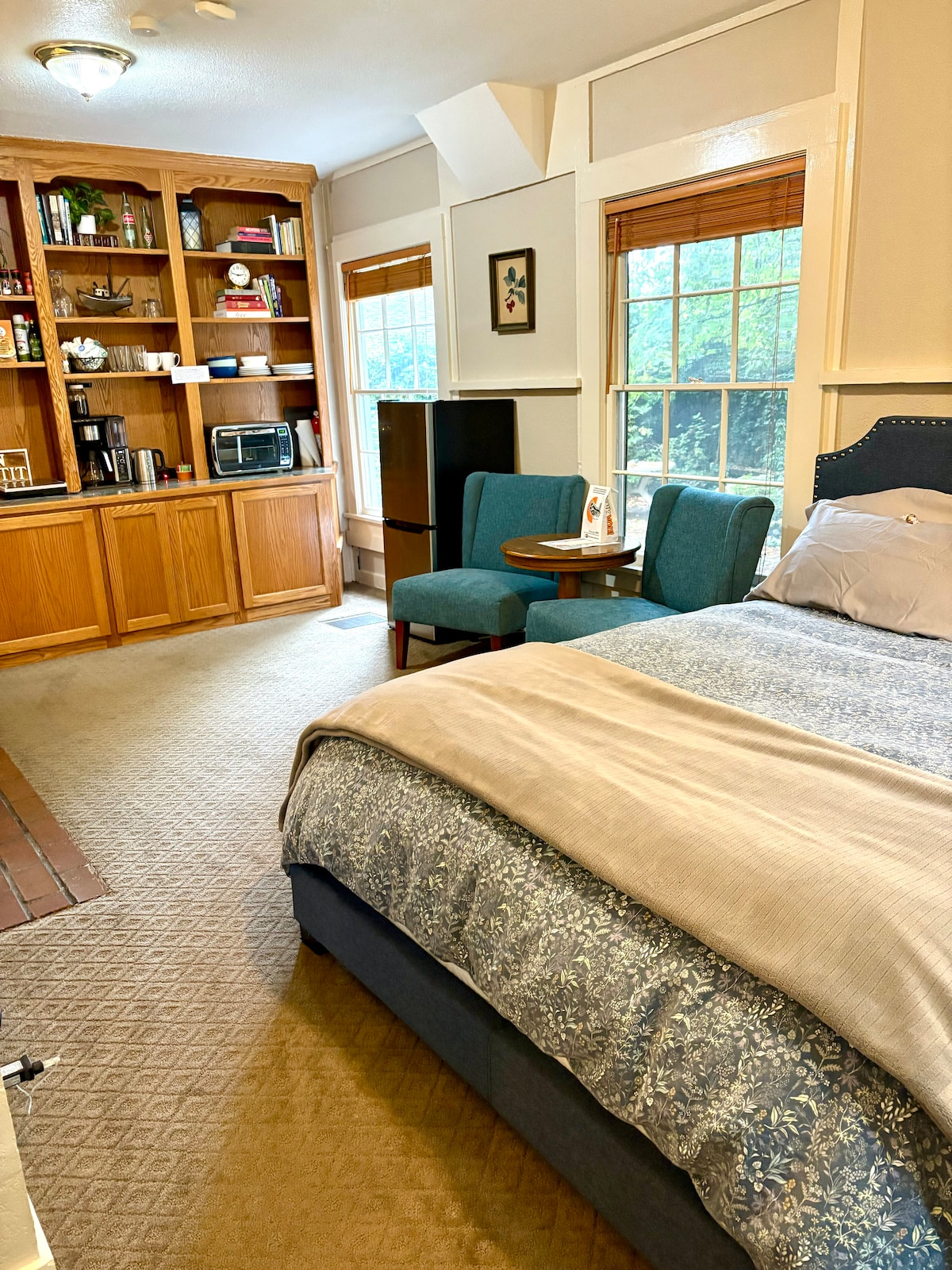 This charming studio cottage sits nestled under a willow tree; creating a mood of serenity. The queen sized bed has a memory foam mattress, & luxury linens. The kitchenette has fridge, microwave, Keurig machine, & electric hot plate. Through the window you’ll see the rustic playhouse & gazebo. The bathroom with shower is sparkly clean. Spacious parking—only a few feet from the cottage. Whether you’re here for a concert or a graduation, this little house will enhance your visit. Fan/no AC