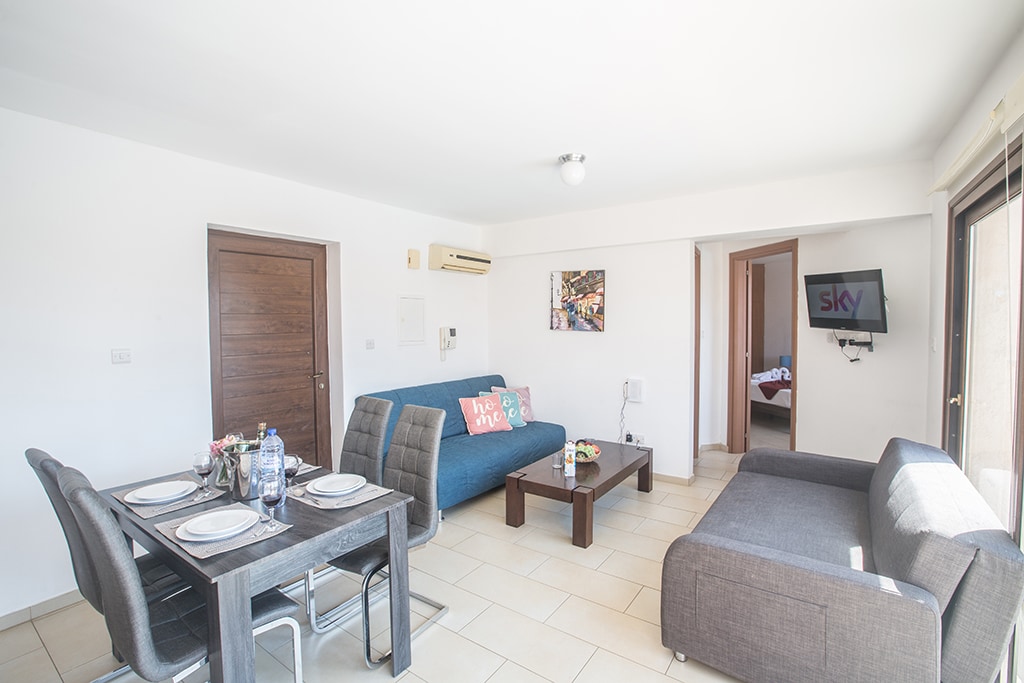 Newly renovated to a high standard, modern 1Bed apartment in the centre of Ayia Napa. Ideally located for exploring the beaches and the local restaurants and bars of Ayia Napa. Fully equipped kitchen, spacious bedroom with air conditioning, modern bathroom and comfortable open plan living room/dining/kitchen area and small balcony. WiFi included.