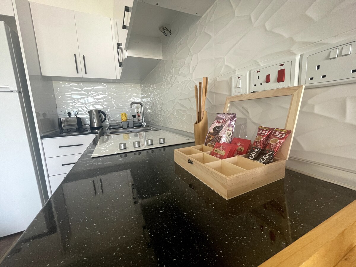 Enjoy the experience at this lovely one bedroom flat at the best location. This is a new built modern flat in a residence complex with balcony where you can sit and enjoy wonderful views of the Mediterranean Sea. All the space is fully air conditioned. You can park easily at apartments private parking space. 5 minutes walk to beautiful sandy beaches & unique Ghost Town Varosha (Kapalı Maraş). Restaurants and bars are in 4 minutes, ancient Famagusta Old Town in 10 minutes walking distance.