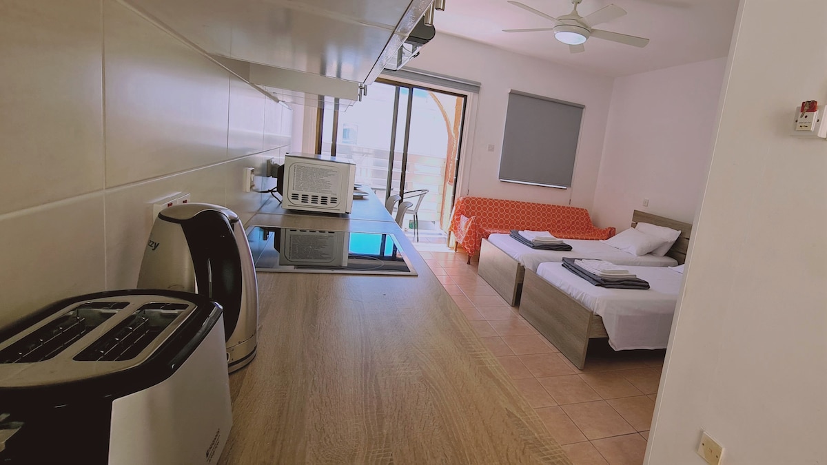 Have an unforgettable time and enjoy first-class hospitality in this lovely studio apartment, located in one of the quietest areas of Ayia Napa. The property is within walking distance of supermarkets, and restaurants but also one of the most legendary beaches in Cyprus. 10 minutes walk to the Beach - Next to Bus stop - Feel like home - Cozy property & Quiet Location - Near Supermarkets & Shops - Free Wi-Fi -Air Condition - Kitchen Fully Equipped - Private Parking