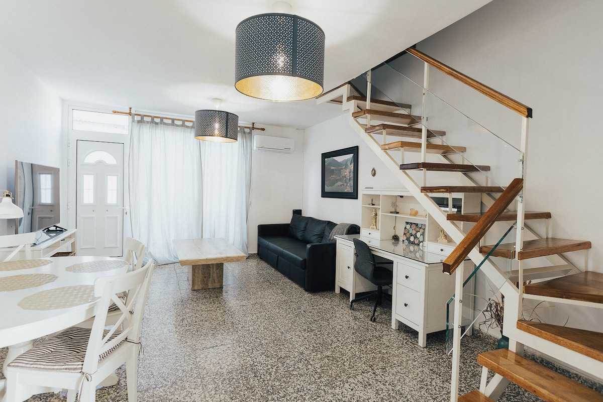 Kick back and relax in this calm, stylish space. A cozy house with a kitchen, dining area and living room in an open space on the ground floor and 3 bedrooms with double beds and a toilet with a bath on the first floor. The house has a total of 110m2, plus 23m2 of outdoor space, with an outdoor shower and a kiosk with a sitting area. It is located on the seafront, with a 2 minute walk to the Agia Triada beach.