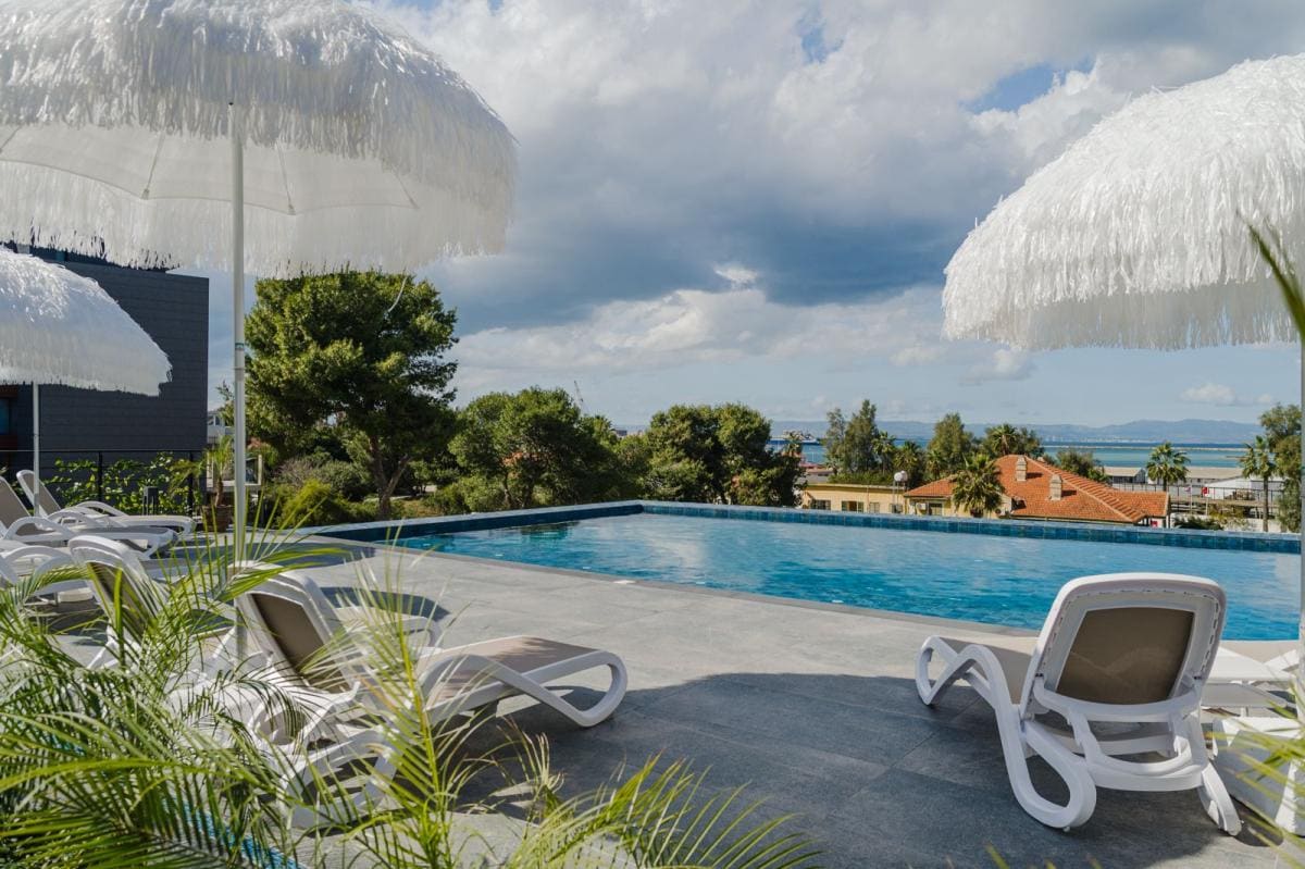Welcome to your Luxury Vacation by the Sea! Sun, sea, serenity, and the endless blue all at your feet; life's true luxuries to say the least! Our 1 bedroom apt. is newly renovated with brand new interior, designed not only in style but also with your comfort at mind. Our biggest plus is the swimming pools, the paddle court, our beautiful grounds and of course the best blue flag beaches our island has to offer all for you to enjoy! So you ahead and spoil yourself, you know you deserve it!