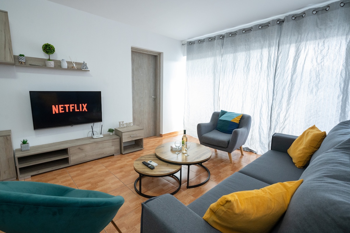 Enjoy the experience at this lovely one bedroom flat at the best location. This is a new built modern flat in a residence complex with balcony where you can sit and enjoy wonderful views of the Mediterranean Sea. All the space is fully air conditioned. You can park easily at apartments private parking space. 5 minutes walk to beautiful sandy beaches & unique Ghost Town Varosha (Kapalı Maraş). Restaurants and bars are in 4 minutes, ancient Famagusta Old Town in 10 minutes walking distance.