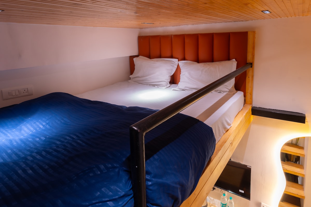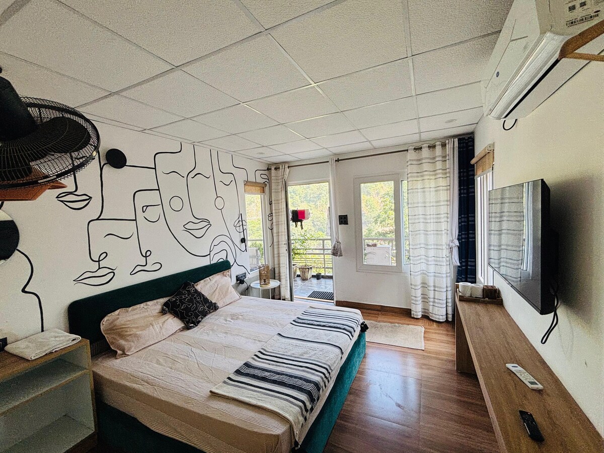 Experience a blend of industrial chic and spiritual serenity in this unique loft-style sanctuary, located just steps away from the iconic Laxman Jhula bridge. Designed for travelers who appreciate open spaces and modern aesthetics, this room offers an airy, elevated retreat in the vibrant heart of Rishikesh.