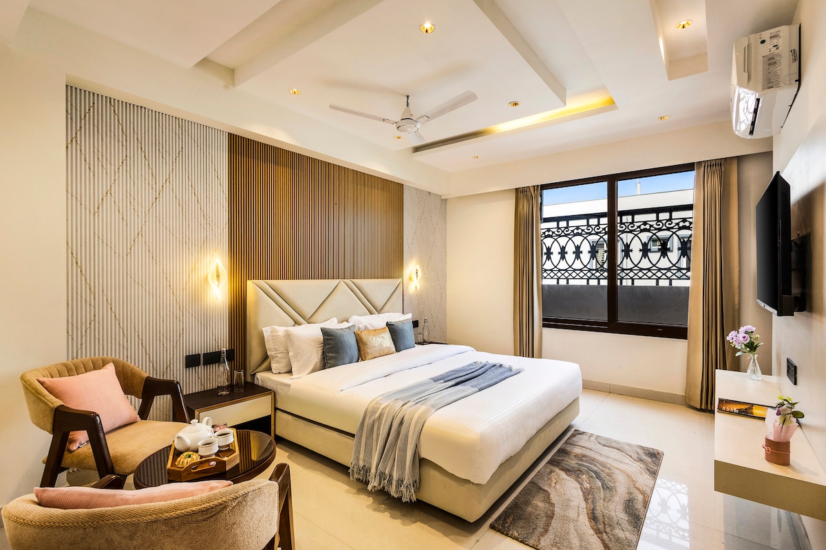 Welcome to Sundowner Stay, a peaceful wabi-sabi themed Ganga view retreat in Rishikesh. Enjoy a private jacuzzi with river views and watch Janki Setu light up in the evening for a magical experience. The room offers a private balcony, instant hot water with heat pump, strong rain shower, and a live hygienic jacuzzi. Perfect for couples or solo travelers or group of friends seeking luxury, calm, and unforgettable memories by the Ganga.