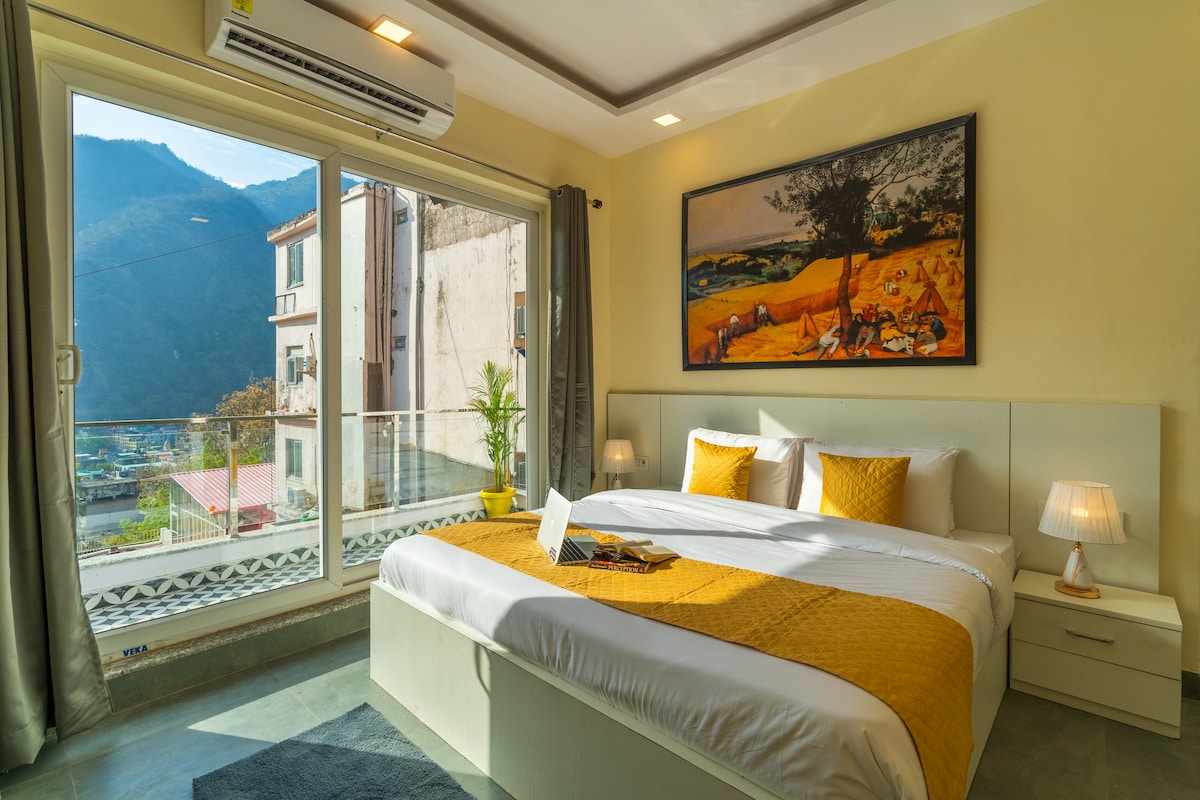 Escape to a peaceful Rishikesh retreat with stunning Ganga & mountain views. This cozy unit sleeps up to 3 guests with 1 bedroom, attached bathroom, and an extra mattress. > Enjoy a private balcony with outdoor seating, > Surrounded by top cafes > Just 1.5–2 km from the Ganga River & Laxman Jhula. Perfect for families, small groups, or anyone seeking comfort and serenity in the yoga capital of the world.