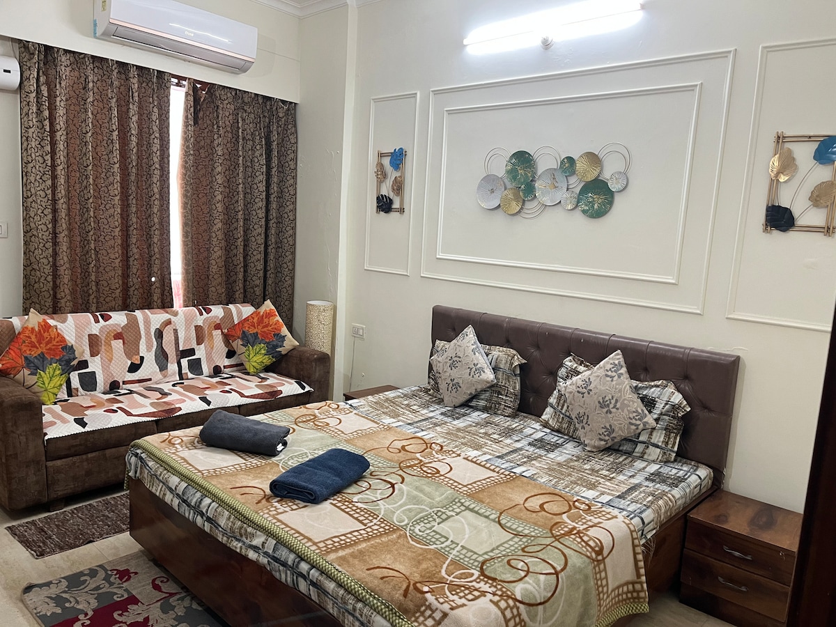 Welcome to a fully air-conditioned flat in the hills, located inside the gated community of Deecon Valley in Tapovan. This beautiful apartment has two aircon. ONLY HOMLEE FLATS HAVE TWO ACs. LAXMAN JHOOLA IS ABOUT 1.5 KM ONLY. All our apartments have free parking, a Fully Equipped Kitchen, a 24/7 Caretaker, & availability of Homemade food. This is a large 750 sq feet 1 BHK apartment having 1 double bed 4 single and comfortable sofa beds and 2 washrooms making it comfortable for large families.