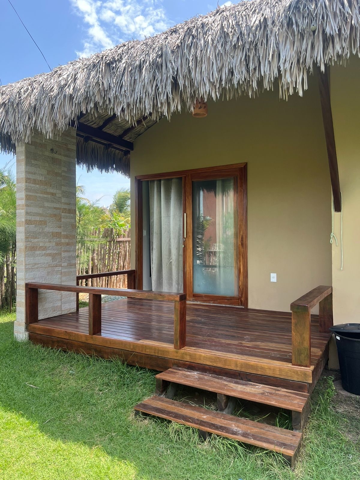 Bangalô de 40m² construído num morro com vista excepcional do litoral, todo rústico mas com muito conforto (ar condicionado, chuveiro quente, frigobar, tv, internet, toalhas e roupas de cama incluídos). Suíte com cama queen e duas camas solteiras (todas de mola). varanda nos dois lados. Área para sentar em baixo com mesa, cadeiras e redes, restaurante e piscina além de café da manhã incluído.