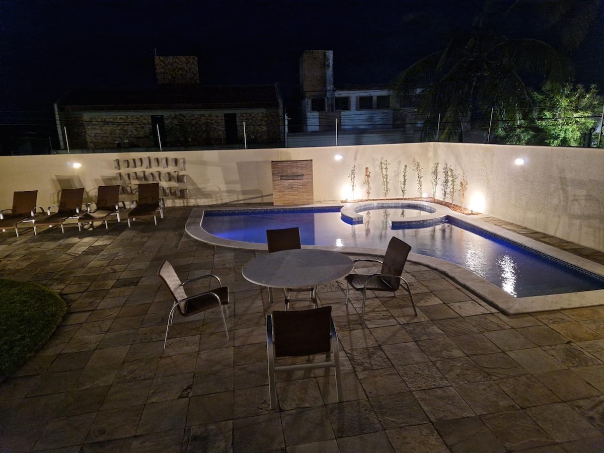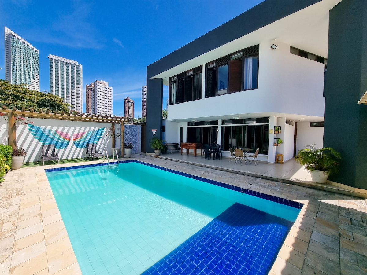 这是Casa Áurea!我敞开家门,让您和您的家人在圣诞节过得开心,距离Ponta Negra沙滩100米,可欣赏大海和Morro do Careca的美景,并且配备有线电视(65、55和39英寸)和互联网。