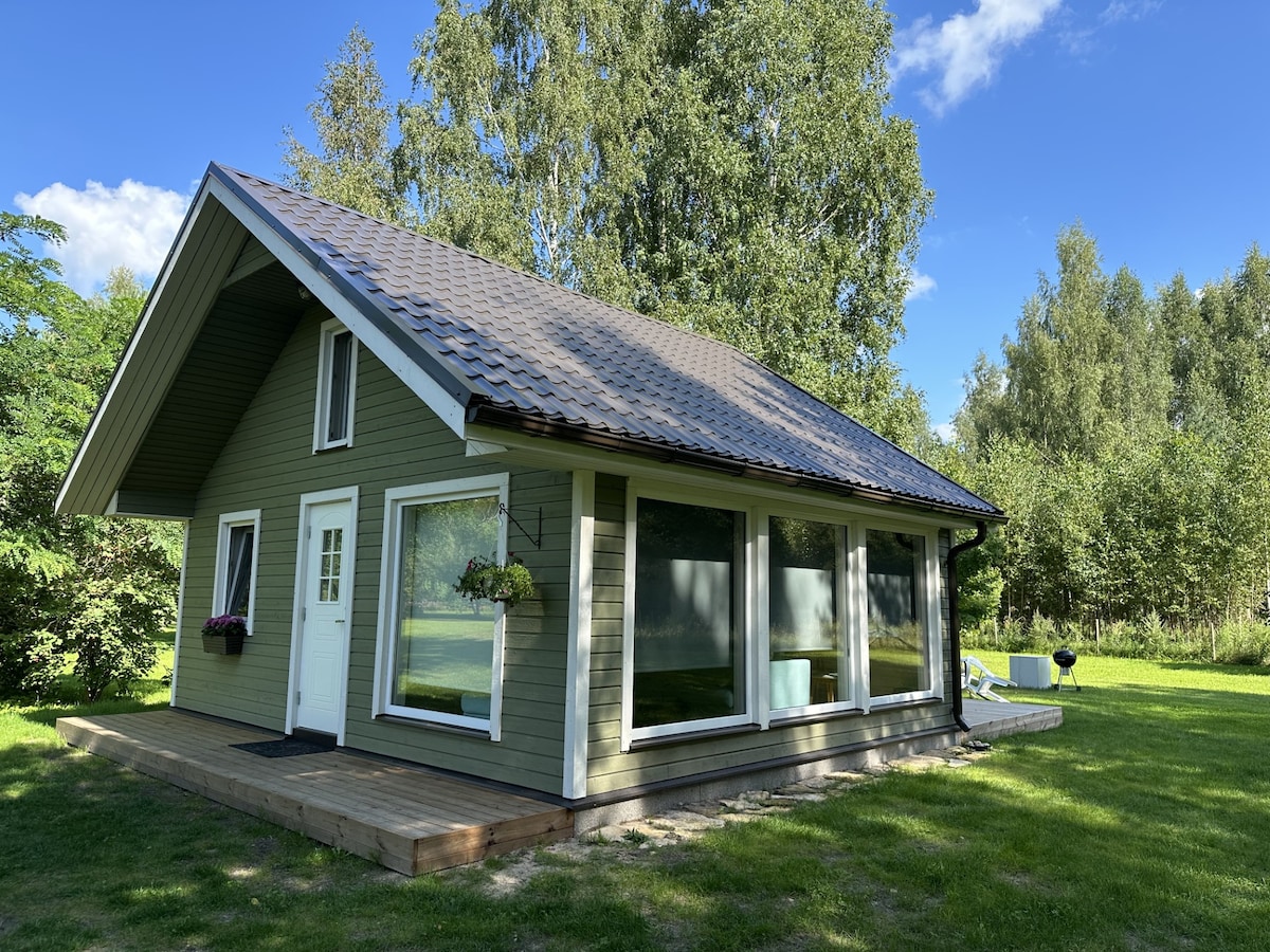 Private summer escape in a cozy cottage. Bedroom with double bed, sofa bed in living room, loft for 8, plus optional glamping tent with 4 beds. Kitchen has all you need for light meals, bathroom with shower. Crib and high chair available. Relax on the terrace with BBQ and swing. Sauna and hot tub (extra fee). Swim in the clear pond, enjoy the playground, soccer goals, bikes, and SUP. Perfect for families or friends! Dogs welcome (extra fee).
