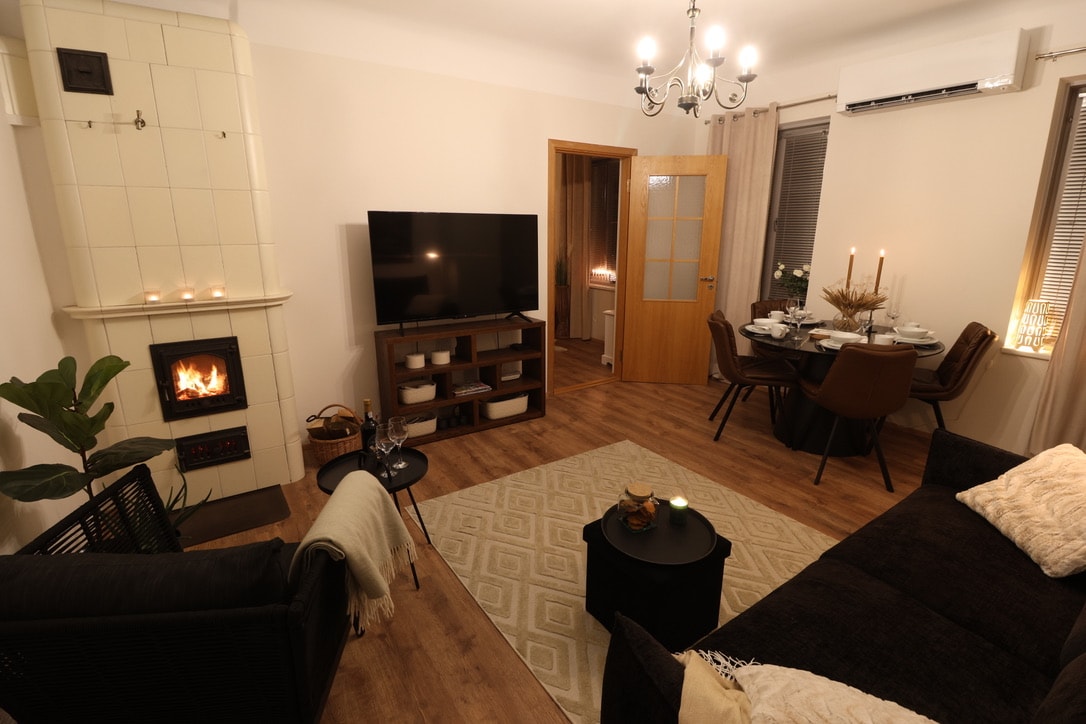 🌞Welcome🌞 to my cozy place near the beach with a terrace, air conditioning and free Wi-Fi! My cozy escape features warm electrical fireplace and everything is just minutes away from popular attractions. Here’s what I offer: 💕Fully equipped kitchen 💕 Washing machine 💕TV with 60 channels 💕Plush bedding for good night's sleep 💕Air Conditioner for refreshing stay Check-in: 18:00 🌞Check-out: 13:00 – perfect for late risers who enjoy leisurely mornings!🌞 Welcome👋