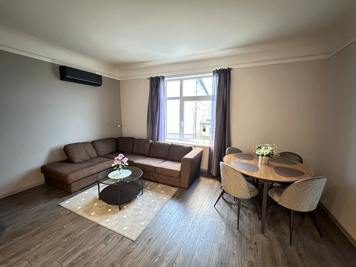 A cozy 2-room apartment (43 m2) in a peaceful area. Apartment is suitable for 1-4 people. There is a living room with sofa bed for 2 persons and bedroom with double bed. Bed linen and towels are available. Well equipped kitchen with dishwashing machine, oven, microwave, refrigerator. Bathroom with shower and washing machine. Apartment has air conditioner. Private entrance with code lock. 13 stair steps lead you to the entrance on second floor, no elevator. Free parking 24/7.
