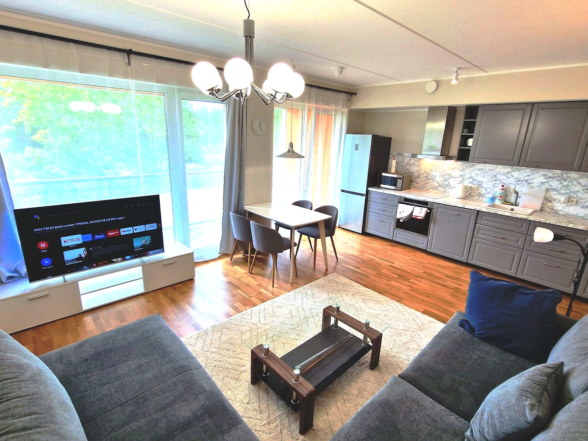 This freshly renovated 34 sqm spacious and cozy studio apartment is ideal for couples or smaller families looking for a peaceful and nice place to stay. It is fully equipped with large windows and an open balcony, lie on a bed or couch and just enjoy epic river and sea views. Flat is within a short walking distance from Pärnu city centre. A 10-minute walk away are shopping centres and a variety of restaurants and bars. In front of the house is a riverside promenade and a jogging track.