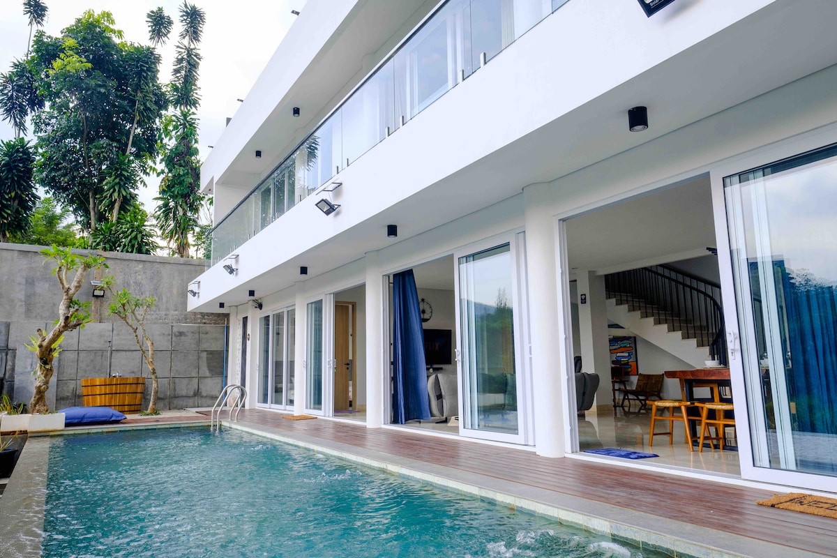 Have fun with the whole family at our stylish place. It’s a heated natural water from the hill (not a hot spring). Open from the living room, your children will love playing in this hot tub 💙 1. TIDAK available untuk pasangan yang BELUM menikah. 2. Setelah jam 10 malam kurangi volume suara dikarenakan area pemukiman. 3. Jam operasional Air Panas di kolam dari jam 6 pagi - 10 malam. 4. NO ALCOHOL, DRUGS, PORN & PARTY. 5. Security patroli 24 jam.